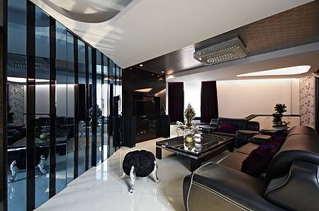 由於客廳向玄關大門處呈現斜切內縮的地形,為了化解壓迫感、同時也兼顧牆面的裝飾性,選用了少見的特殊藍鏡搭配黑色烤漆玻璃作拼貼,借用鏡射的視覺放大效果外,也讓畫面變時尚了。另一方面,屋主選擇的玄關大門相當大器,在色彩上也與藍鏡呈現反差效果。仔細瞧瞧,與玄關門正面對應的鏡櫃典雅而恰如其分吧?!其實這是為了包覆結構柱而設計的,是不是也騙到你了呢?