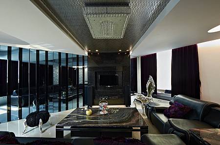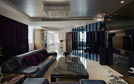 三角形的基地問題確實是客廳設計的一大難題,為了保留更大主牆面寬,先以最大斜邊作為沙發背牆,但電視卻只能設置於尖角處,因此決定另架一片平行於沙發牆的窄版大理石牆來擺電視,而左側以扇形角度延續發展出一片藍鏡與黑玻相間的線條鏡牆,讓電視牆有放大的錯覺,至於電視牆後的三角畸零空間則利用作為儲藏間。