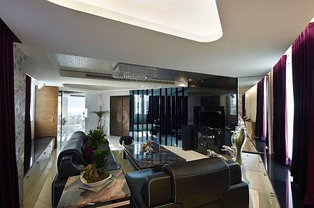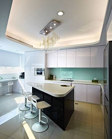 設計概念及個案說明:從事婚紗攝影工作多年,業主天天都是在為別人編織結婚成家的美夢,但每天浸淫在羅曼蒂克的工作氛圍中,業主心目中的家到底是什麼模樣呢?答案揭曉!為了營造出業主喜歡現代簡潔風,所以整個客廳以藍鏡牆面、幾何切割的天花板,以及綿延的絲絨窗簾等元素,創造奢華現代風的畫面。而一般大宅重視的正式餐桌則因夫妻倆工作忙碌,家中極少開伙而決定捨棄,不過疼愛女兒的屋主,平日會撥空弄早餐、點心給女兒暖暖胃,所以,在餐廚空間上打破傳統長桌或圓桌的制式設計,反而依循廚房的三角格局規劃輕食中島餐檯,搭配白色櫥櫃、加上滿滿灑入的陽光,感覺比大餐廳還幸福、還有Fu!最棒的是,這些當初困擾業主的畸零格局問題全被轉化成獨家的特色了!