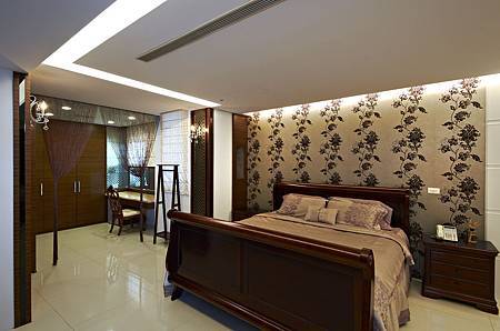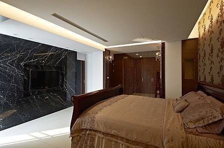 五樓主臥室的設計風格有別於樓下客、餐廳的現代簡約,除透過格局修正將三角區塊牆線盡量拉齊,使電視牆更端正氣派外,牆線內的三角區也變身為儲藏室,增加收納機能;另外,電視主牆以閃電美人大理石材來鋪陳出尊貴感,搭配原木色澤及古典壁紙的床背牆更能襯托出主臥室的端莊,呈現出英式新古典的內斂與靜謐。
