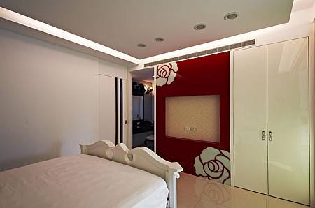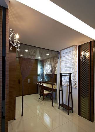 主臥室的格局問題之一在於柱體多,但危機也可以是轉機,透過規劃將二根柱體變為區隔臥床與出入動線的拱門造型,配合水晶壁燈的裝飾則讓空間更具有古典美。另外,再運用線簾來界定化妝區,使其與臥床間更有穿透感與互動性,當然整個主臥室也會更見寬敞。