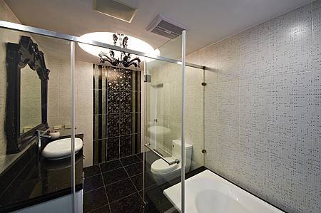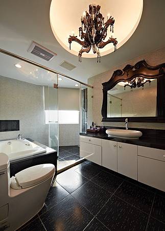 主臥衛浴空間的條件相當優渥,不僅格局寬敞、光線充足、設備也齊全。整個空間先運用特殊的立體磁磚鋪陳壁面,營造出空間質感,再以乾溼分離規劃,將檯面區與沐浴區正式隔開,並且運用新古典風格的鏡框與吊燈讓整體空間更具有裝飾美感,至於浴缸區則安裝有液晶電視,讓泡澡的時光更增添娛樂享受。