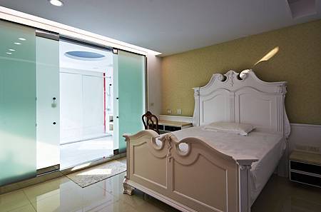 從平面格局來看,女兒房是呈直角梯形狀,規劃時先將空間切成正方形臥床區,和床尾的三角更衣間,以及側面以玻璃推門區隔開的二進式乾溼分離衛浴空間,讓視線所及的壁面更端整。另外,床背牆面選擇鵝黃色壁紙,正好可以襯托出白色古典床架的優雅,而床尾則有玫瑰圖騰的烤漆玻璃配合衣櫥門片設計,讓空間透出青春氣息。