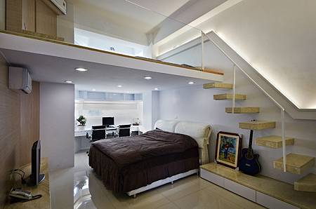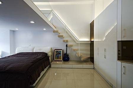 櫥櫃門片採用亮面白色美耐板,些微反光的材質特色讓室內風格也像個陽光男孩般明快,而石材踏階的設計則表現出個性的律動。在上下雙層各自設有睡眠、閱讀、看電視、等獨立機能,而且上下夾層空間的高度都很充足,即使大男孩在這兒也不覺得壓迫,而原木紋路的地板與電視主牆則醞釀出自然質感。