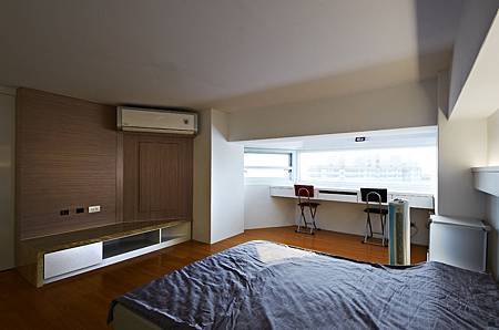 六樓是二位公子的天地,感情不錯的兄弟倆同住在一個房間,房內採局部挑高的夾層設計。為符合年輕人的品味採用現代自然風格,在色彩規劃上以白色為基底,再透過原木色澤的塊體或線條來勾勒出自然感,另外,除了引進充足自然光外,也以間接的嵌燈在壁面上或天花板上創造明快光感。