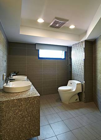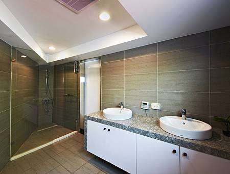 男孩房衛浴空間選用大地色系磁磚延續了自然感的空間風格,而雙人檯面的設計原本是為了讓二兄弟使用上更方便,卻更能營造出飯店般的從容氣度;另外,淋浴區則利用畸零的角落格局來設計,在使用上或視覺上都不影響整體感,使空間發揮最大效益。
