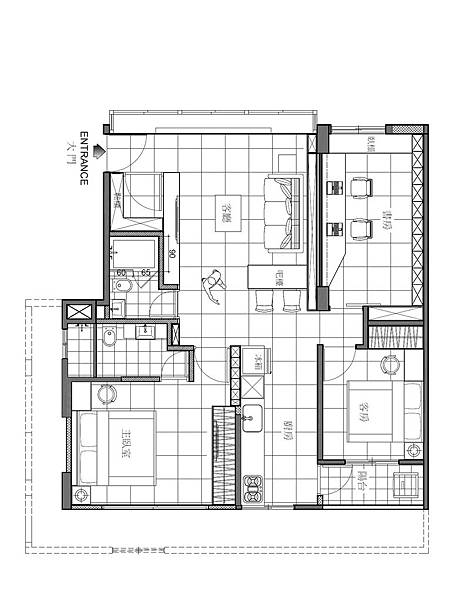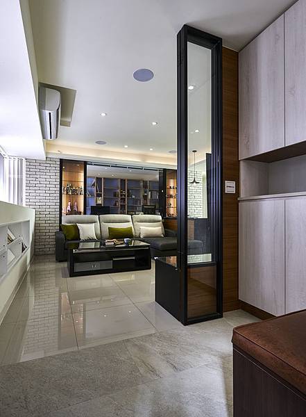 空間寬敞的玄關因鐵件玻璃屏風的穿透效果,讓入門視野更開闊外,客廳電視牆也因此減低封閉感;而選關除規劃大量收納櫥櫃外,地坪部分刻意選用40*90CM的進口磚,與室內石英磚區隔,以界定出室內外空間。
