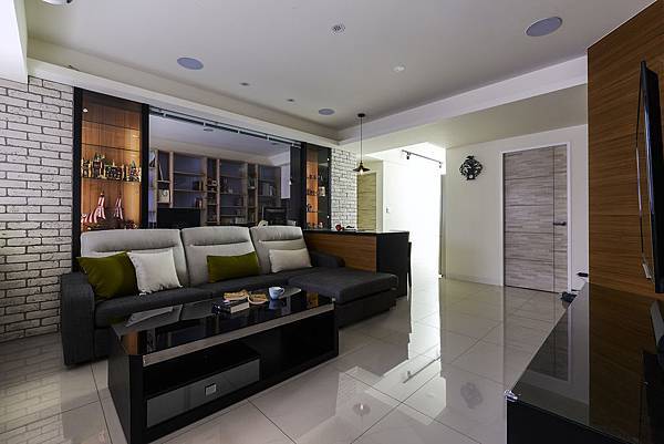 原本因客廳有過深問題,使沙發與電視牆距離過大,加上屋主希望能增加一間客用浴室,因此,利用客廳電視牆拉出牆線,將後方近大門處做玄關,靠吧檯區則規劃浴室,不僅提供更完整生活機能,也調整出更好的空間比例。