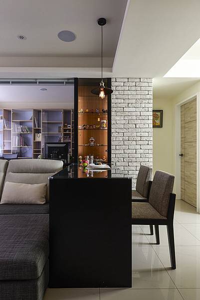 小夫妻倆喜歡膩在吧檯用餐、看電視、聊天。同時,由於吧檯位於整個家的樞紐位置,除了定位出客廳與臥房區的內外界線,並借一盞工業風吊燈轉移目光焦點,虛化天花板低樑問題;此外,在吧檯與展示櫃連結的下方還隱藏有管線櫃。