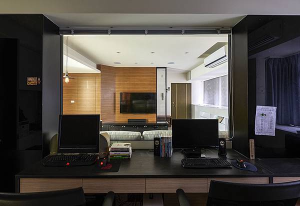 屋主習慣在書房內邊工作、邊看電視,為此特別在客廳天花板與書房內安裝連動喇叭,不僅讓客廳的影音在書房也可同步享受,更可像聲控室般地指揮坐鎮;另外,玻璃牆左右二側的櫃門採用黑烤玻璃,可提供寫字、記事功能。