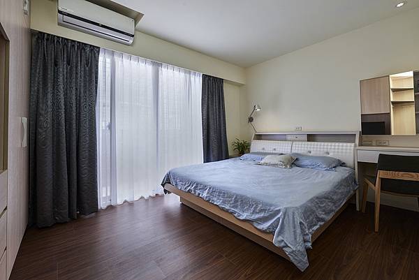 主臥室除了採光面大,還擁有可走出戶外的陽台,搭配室內木家具與休閒裝潢,相當具有療癒質感,讓屋主可在此獲得充分休息。