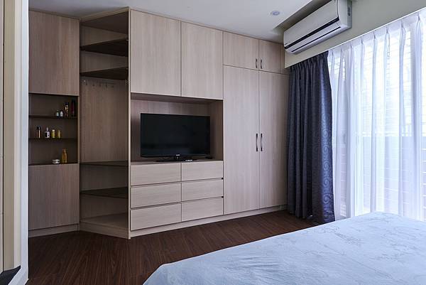主臥室床尾以全牆面的系統櫥櫃設計取代更衣間,不僅提供超大收納量,同時因應動線曲折在入門處設計薄櫃,而銜接衣櫥的斜切櫃則作開放設計,提供不同的櫥櫃機能,也可避免大量櫥櫃的封閉壓迫感。